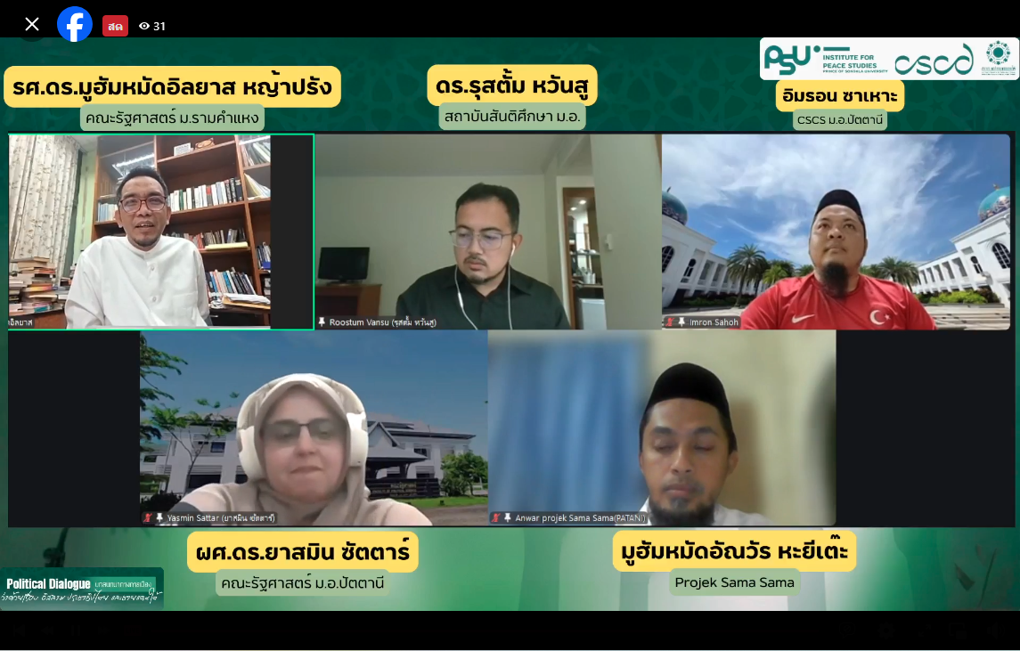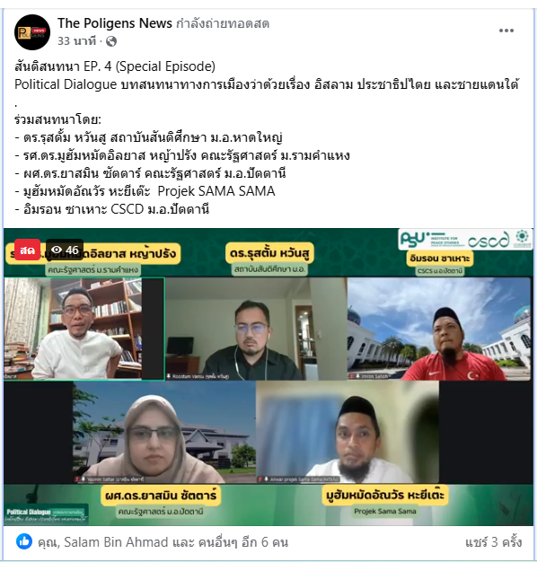 เมื่อวันที่ 7 มกราคม 2569 ที่ผ่านมา สถานวิจัยความขัดแย้งและความหลากหลายทางวัฒนธรรมภาคใต้ สถาบันสันติศึกษา มหาวิทยาลัยสงขลานครินทร์ ร่วมกับ สภาประชาสังคมชายแดนใต้ จัดรายการสันติสนทนา EP. 4 (Special Episode) Political Dialogue บทสนทนาทางการเมืองว่าด้วยเรื่อง อิสลาม ประชาธิปไตย และชายแดนใต้