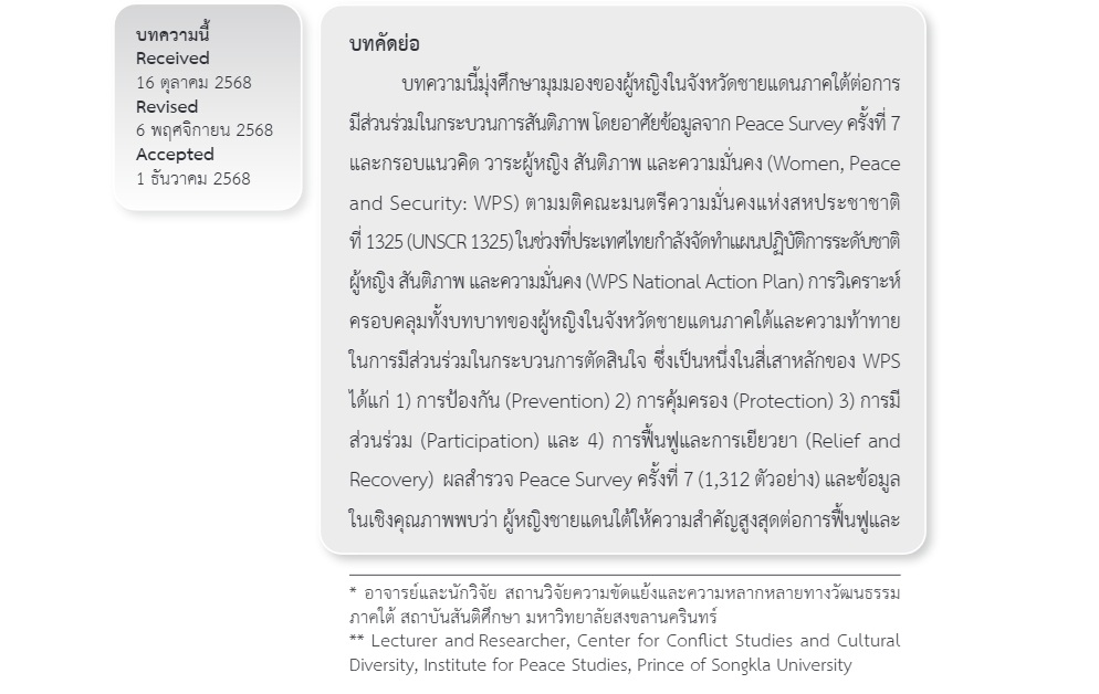 By cscd team on Wed, 2026-02-25 - 14:06 ที่มา วารสารสถาบันพระปกเกล้า ผลงานตีพิมพ์ บทความวิจัย สถาบันพระปกเกล้า ผลสำรวจความคิดเห็นประชาชนต่อกระบวนการสันติภาพจังหวัดชายแดนภาคใต้